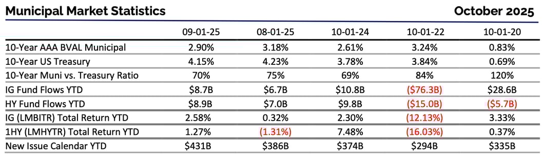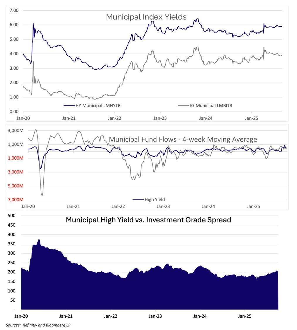 Buoyed by treasury market stability and favorable technicals, investment grade municipal bonds (LMBITR) posted second consecutive month of positive performance and best September returns since 2009, ultimately gaining 2.26% this month (2.58% YTD). The Bloomberg Municipal High Yield Total Return Index (LMHYTR) outperformed, returning 2.61% in September, but still lags investment grade YTD, gaining 1.27% in 2025.