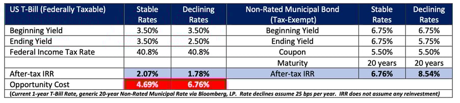 To help investors compare the new opportunity cost of short-term taxable instruments compared to non-rated tax-exempt bonds, we have updated our Cost of Complacency analysis. We have created two simple scenarios over a 5-year time horizon using current US T-Bill rates and generic 20-year non-rated municipal rates: a stable rate environment going forward and a modest 0.25% reduction in rates per year.